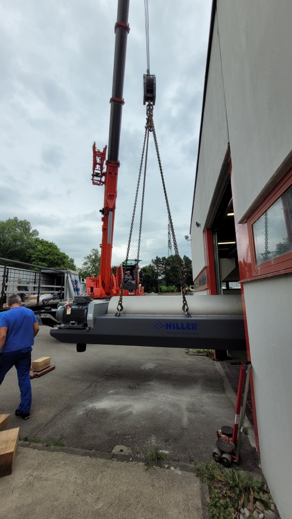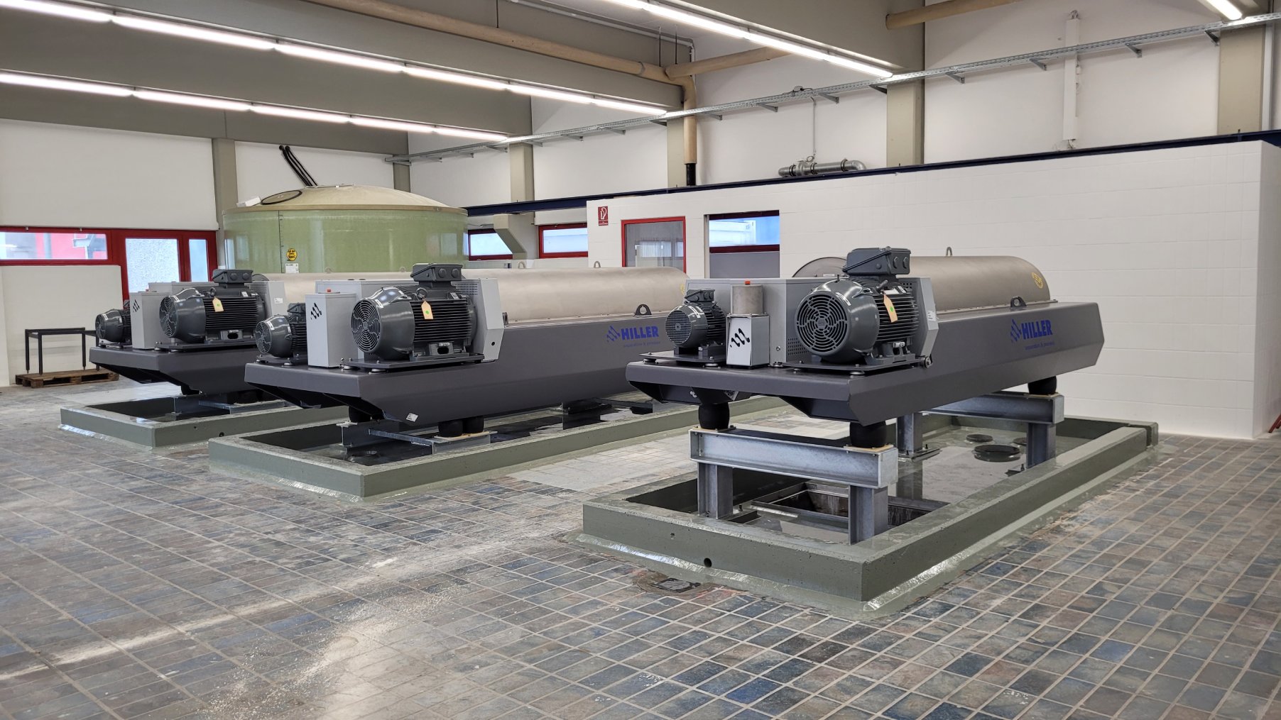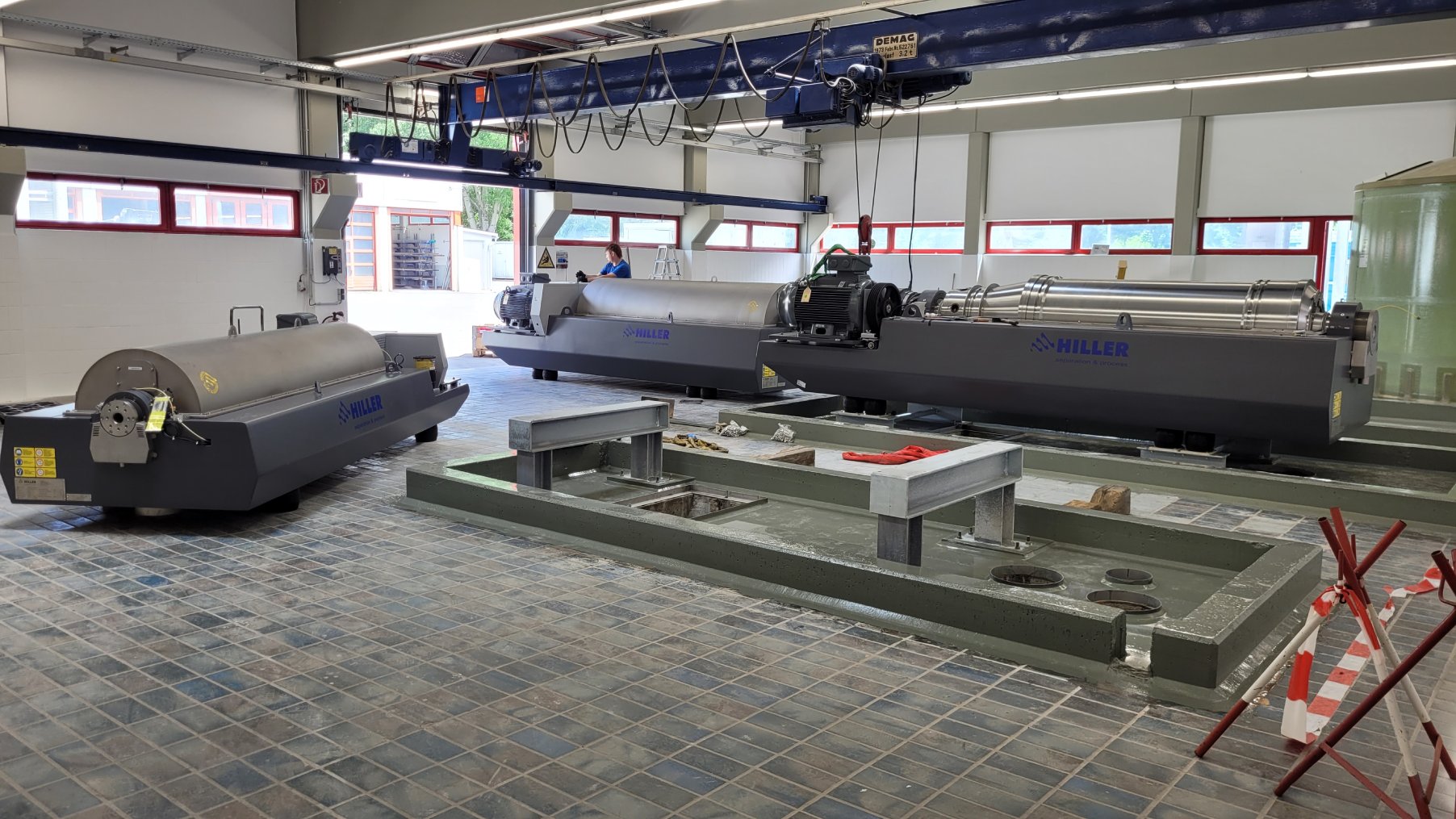 Bei der neuen, maschinentechnischen Ausrüstung wurden die drei Zentrifugen sowie der Flockungshilfsmittelbehälter geliefert. Die Zentrifugen wurden in Zusammenarbeit der Firmen Hiller, Lohr und AZV auf die neuen Fundamente gesetzt. Dabei mussten die Zentrifugen aufgrund ihres Gewichtes zuerst auseinandergebaut und anschließend wieder zusammengesetzt werden. Der Flockungshilfsmittelbehälter wurde an Ort und Stelle von der Firma Haase erstellt.