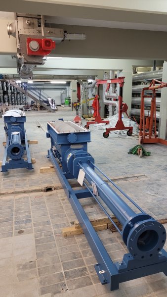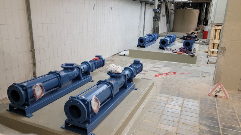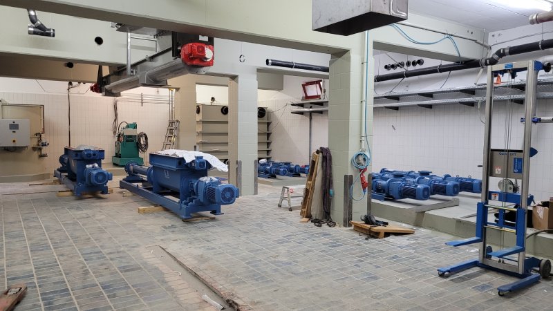 In der Schlammentwässerung wurden die Montagearbeiten aufgenommen. Als erster Schritt erfolgte die Installation der Verteilerschnecke unterhalb der Zentrifuge. Im Anschluss daran wurden die Schlammzuführ-, Zentratwasser- und Dickschlammpumpen am vorgesehenen Anlagenstandort positioniert. Zudem wurde das Hydraulikaggregat für das Klärschlammverladesilo fachgerecht aufgestellt und an die erforderlichen Versorgungsleitungen angeschlossen.