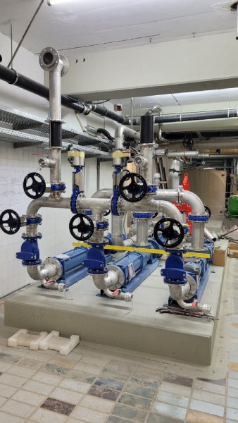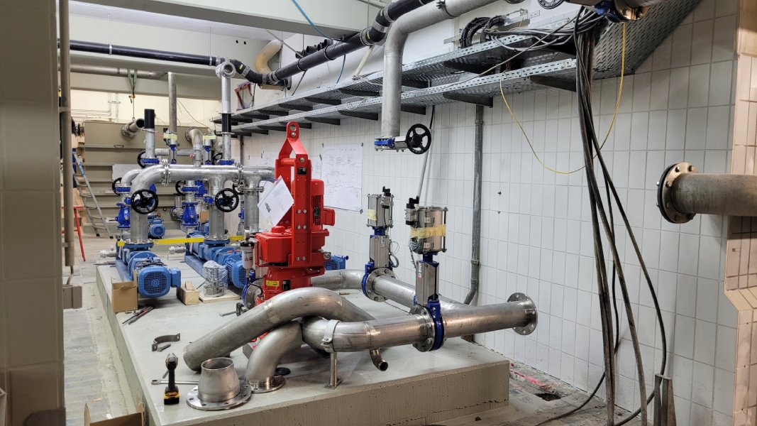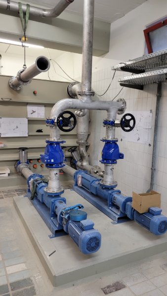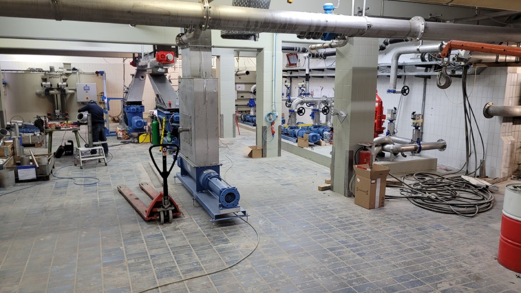 Die Pumpen für die Schlammzuführung und Zentratableitung wurden installiert. Diese werden nun in das bestehende System eingebunden. Ebenfalls konnte das Hydraulikaggregat für das Schlammsilo angeschlossen werden. Da nach Fertigstellung der Schlammentwässerung ein größtmöglich flexibler Betrieb mit unterschiedlichen Pumpen und Zentrifugen möglich sein soll, sind hier viele Rohrleitungen und Schieber notwendig.